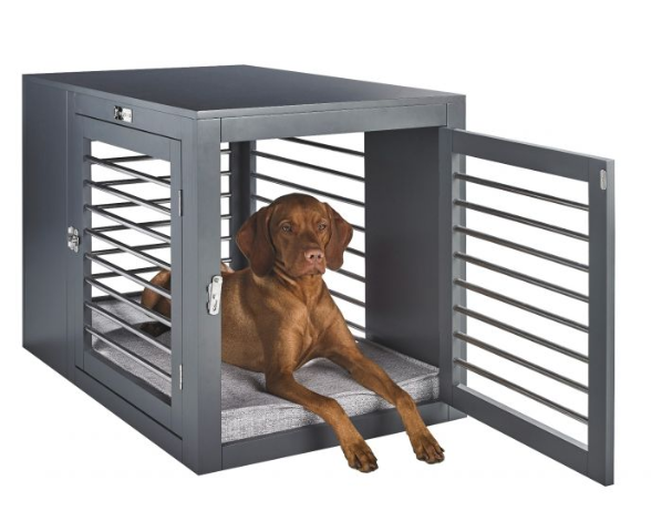 If you like clean lines and modern furniture, this is the Wood dog crate for you. It has sophisticated clean lines, cabinetry finish, and crates are accented with brushed steel bars.